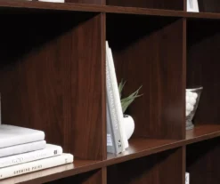 Store in splendor using this fantastic Sauder cube organizer. Nine openings allow you to showcase your favorite pieces and store away items in storage bins as the tabletop provides plenty of space for additional design. Finished in a rich autumn cherry hue, it’s perfect for display in an entryway, living area or study.