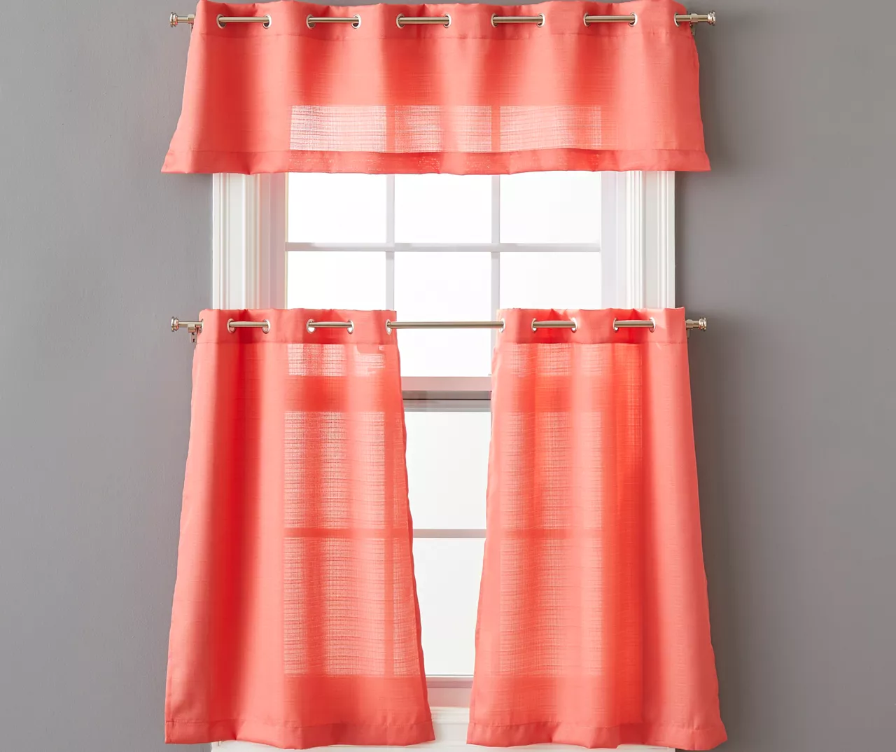 Enhance your kitchen, bathroom or other small window with the casual textured fabric of this Tucker textured semi-sheer grommet kitchen curtain valance and tiers set from Real Living. The coral pink color maintains a warm and cozy feel as the curtains gently filter the light, making this set a great addition to your window.