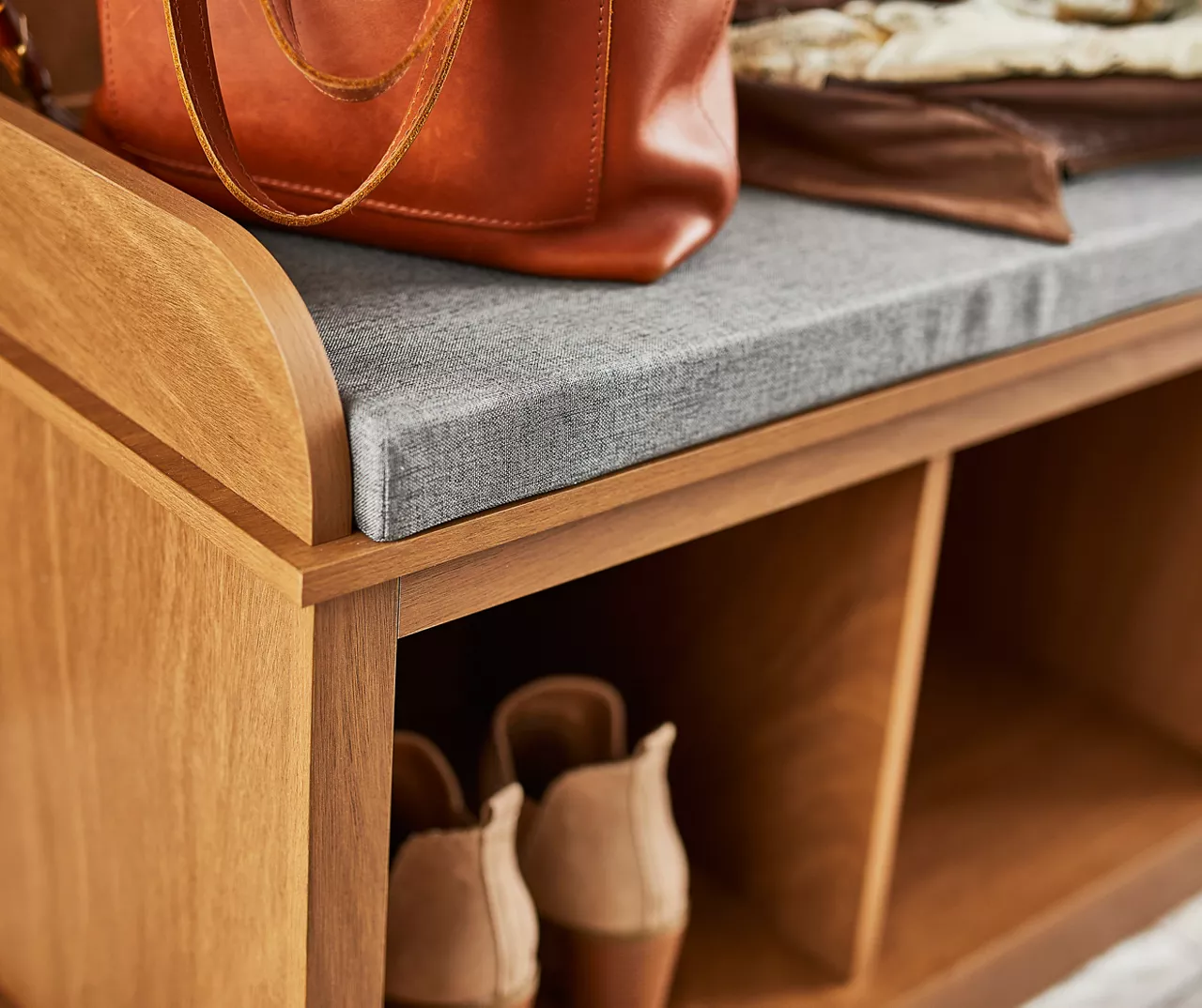 - Gray cushioned seating allows you to easily put on or take off shoes