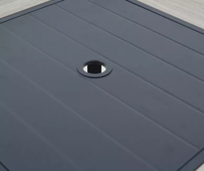 Gather outdoors with loved ones and friends around the Rome dining table. The classic square-shaped table is constructed from sturdy powder-coated steel and accented with a tile top featuring a woodgrain look. Complete with a hole in the center for an umbrella, this table is a stylish addition to a patio or deck.