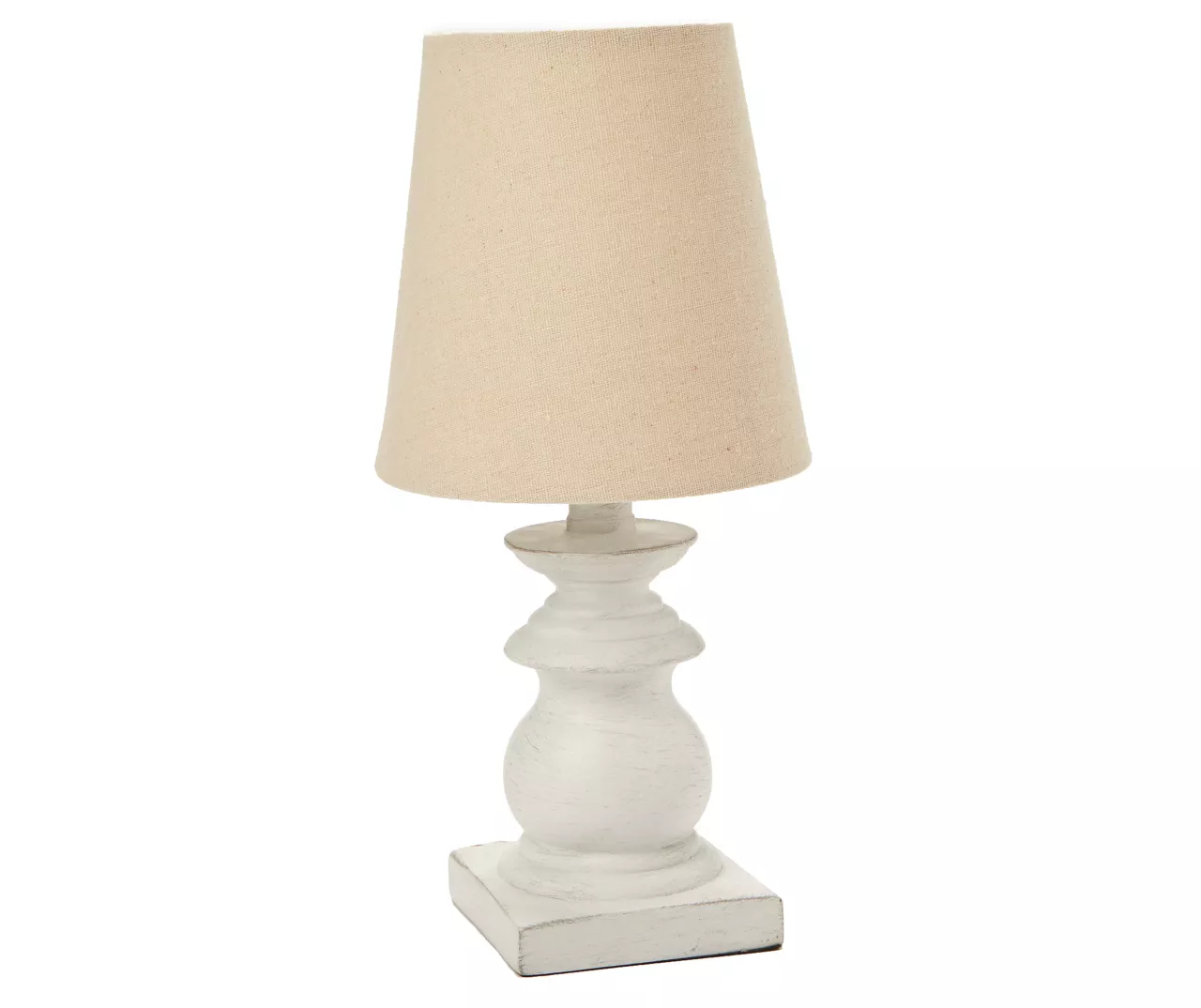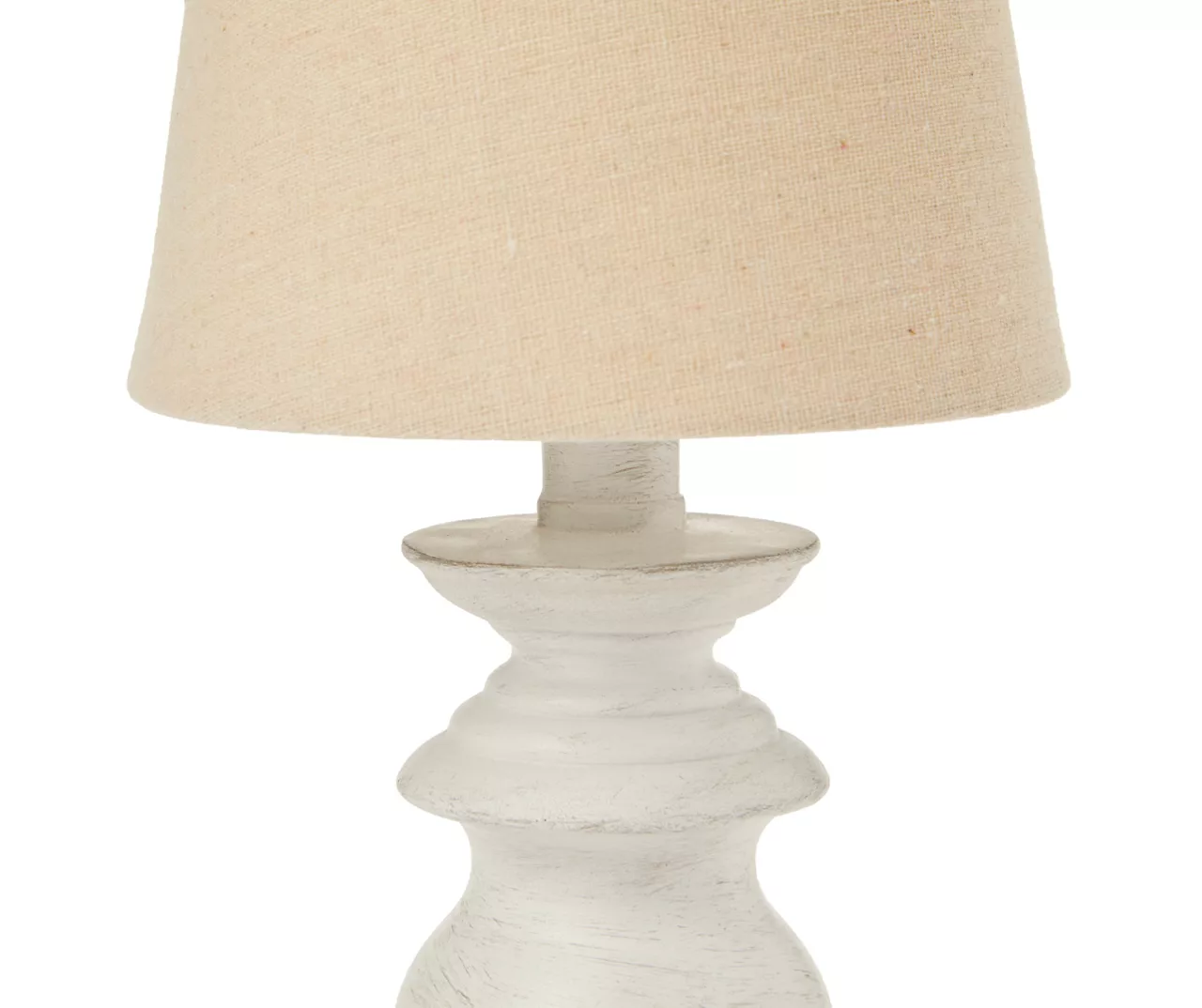 With a finial-style base design in a white hue, this modern home accent adds classic architectural appeal to your space while filtering soft, warm light through its fabric shade.