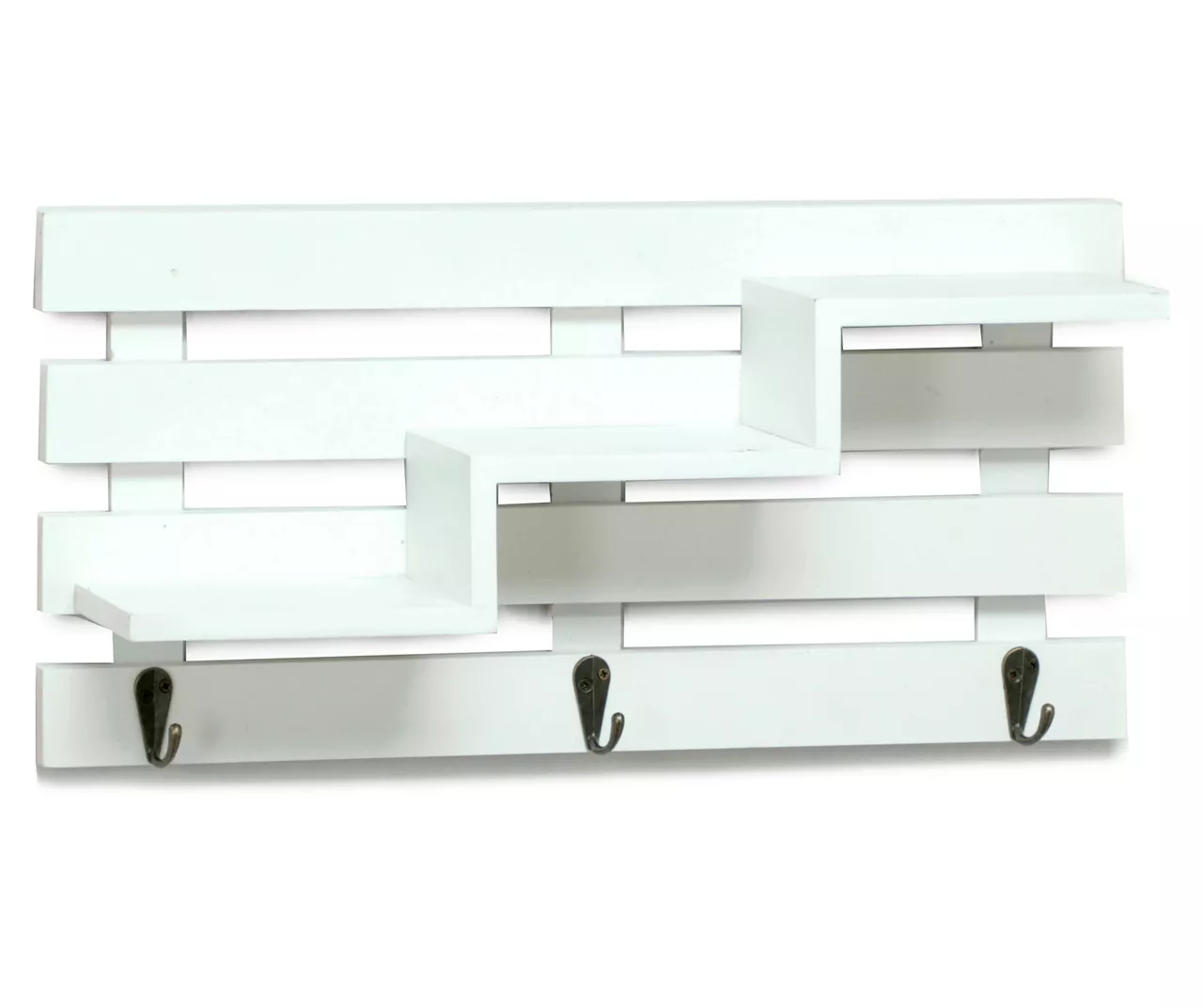 Tiered shelves top a row of handy hooks for a decorative wall piece that provides staggered space for your knickknacks and small home accents, while keeping your keys organized and within easy reach. An open slat background finishes the look with traditional crate-inspired style.